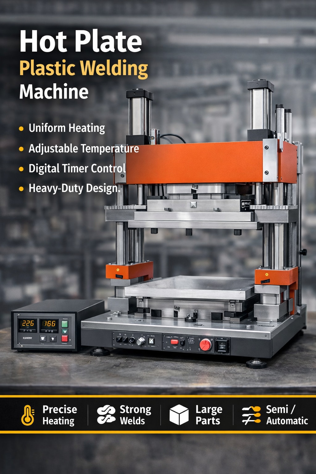 A Hot Plate Plastic Welding Machine is an advanced industrial solution designed for joining large and complex thermoplastic components with high strength and durability. This welding process uses a heated platen (hot plate) to melt the joining surfaces of plastic parts before pressing them together to create a permanent bond.